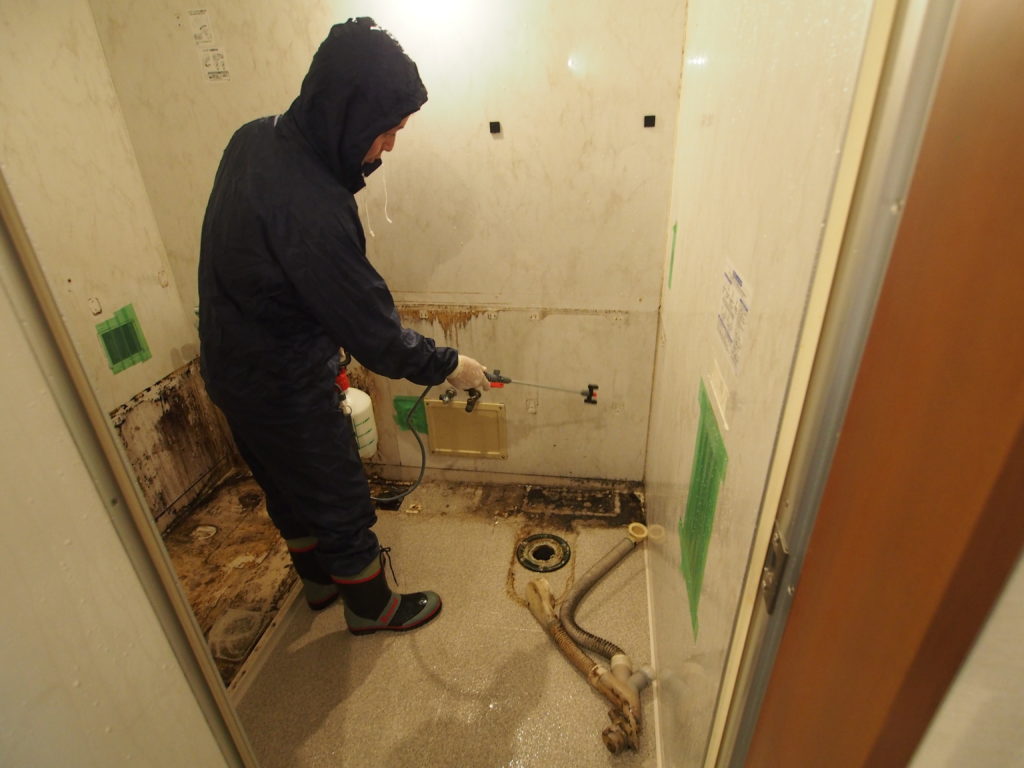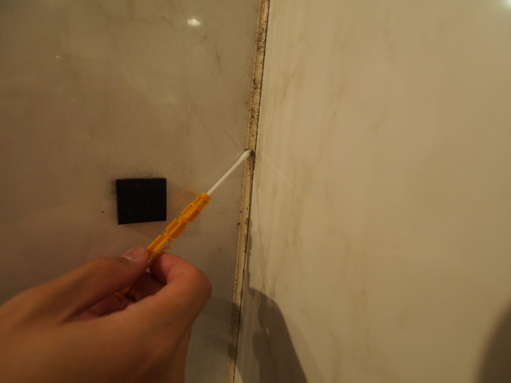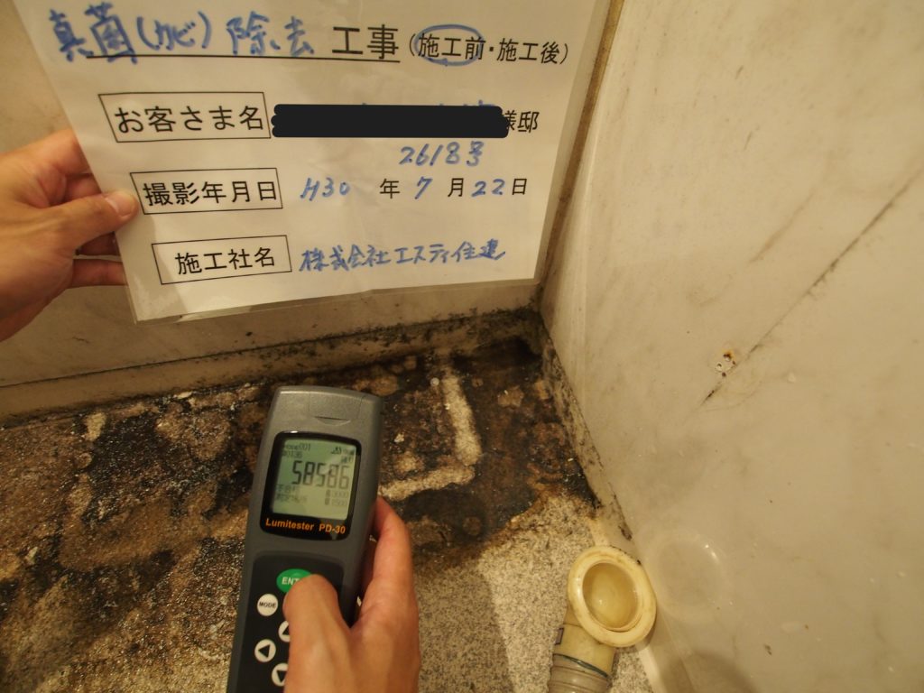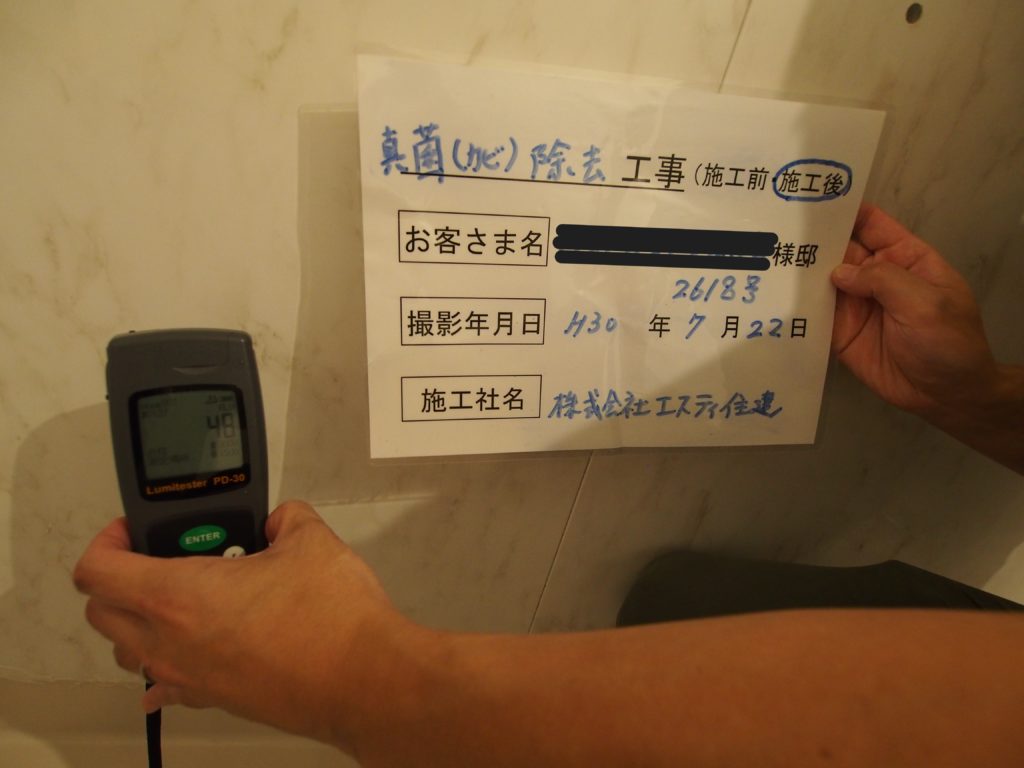 カビ除去を終えた後、水垢や汚れ皮脂油等を水洗いで取り除いていきます。この下地処理も重要でパネルやシートを上張りすると見えなくなる部分です。見えなくなる部分ほどより丁寧に行うのが弊社のこだわりです。