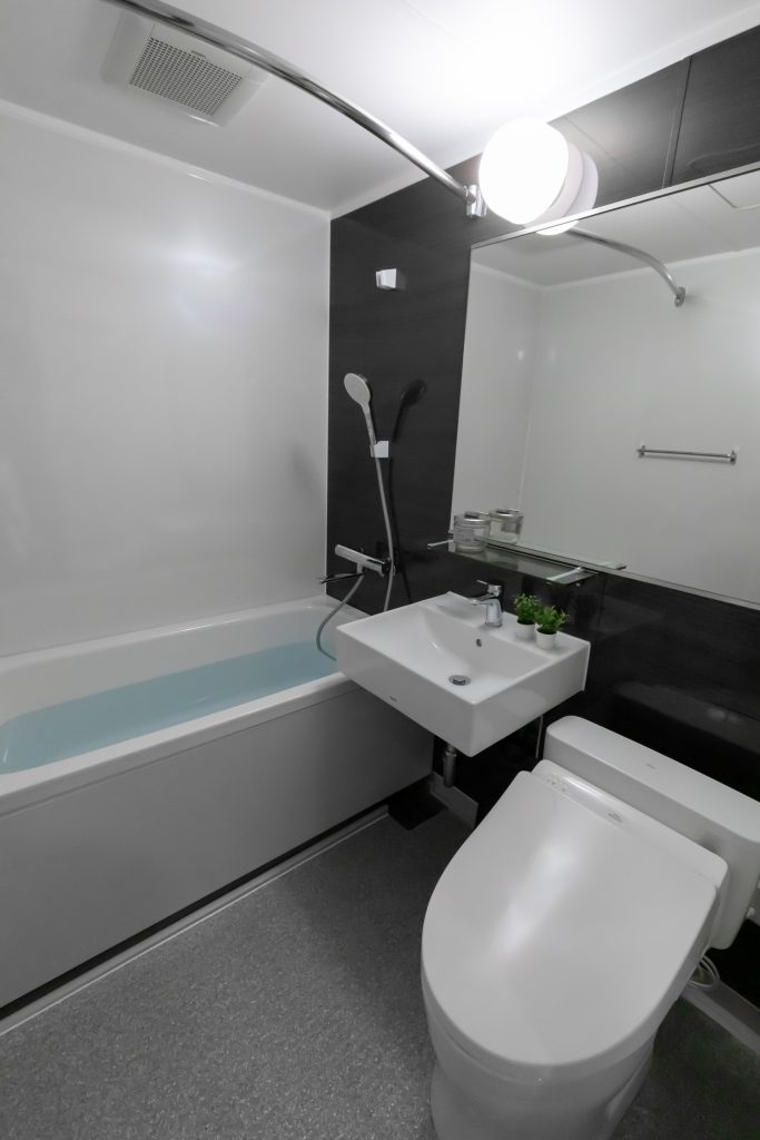 不具合が最も少ないTOTO製の一体型便器、洗面器、水栓を採用し長くご愛用頂けます。大きな鏡と昼白色の照明により全体をより広く明るく演出しました。